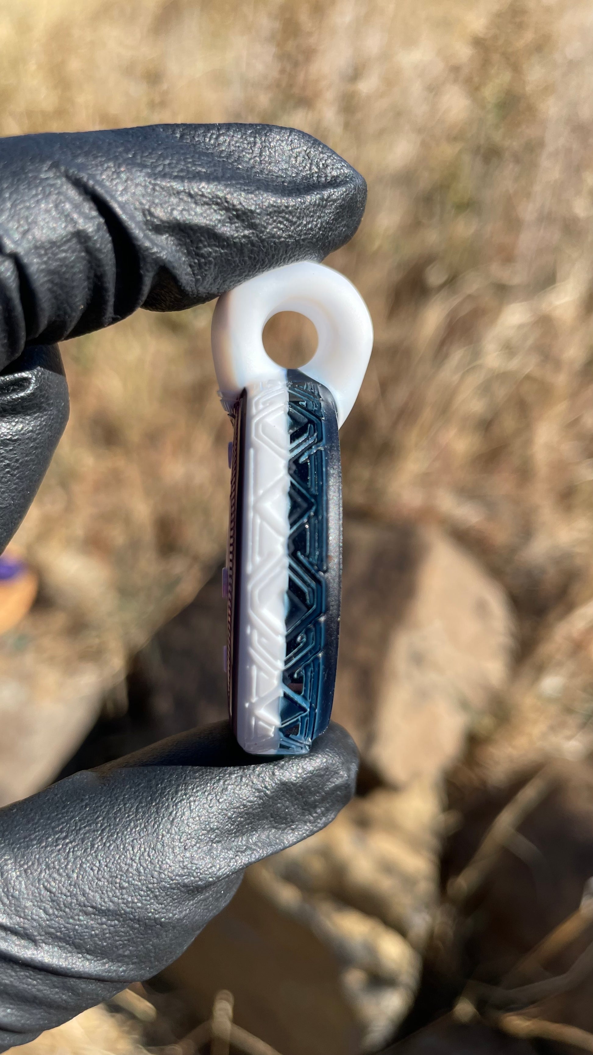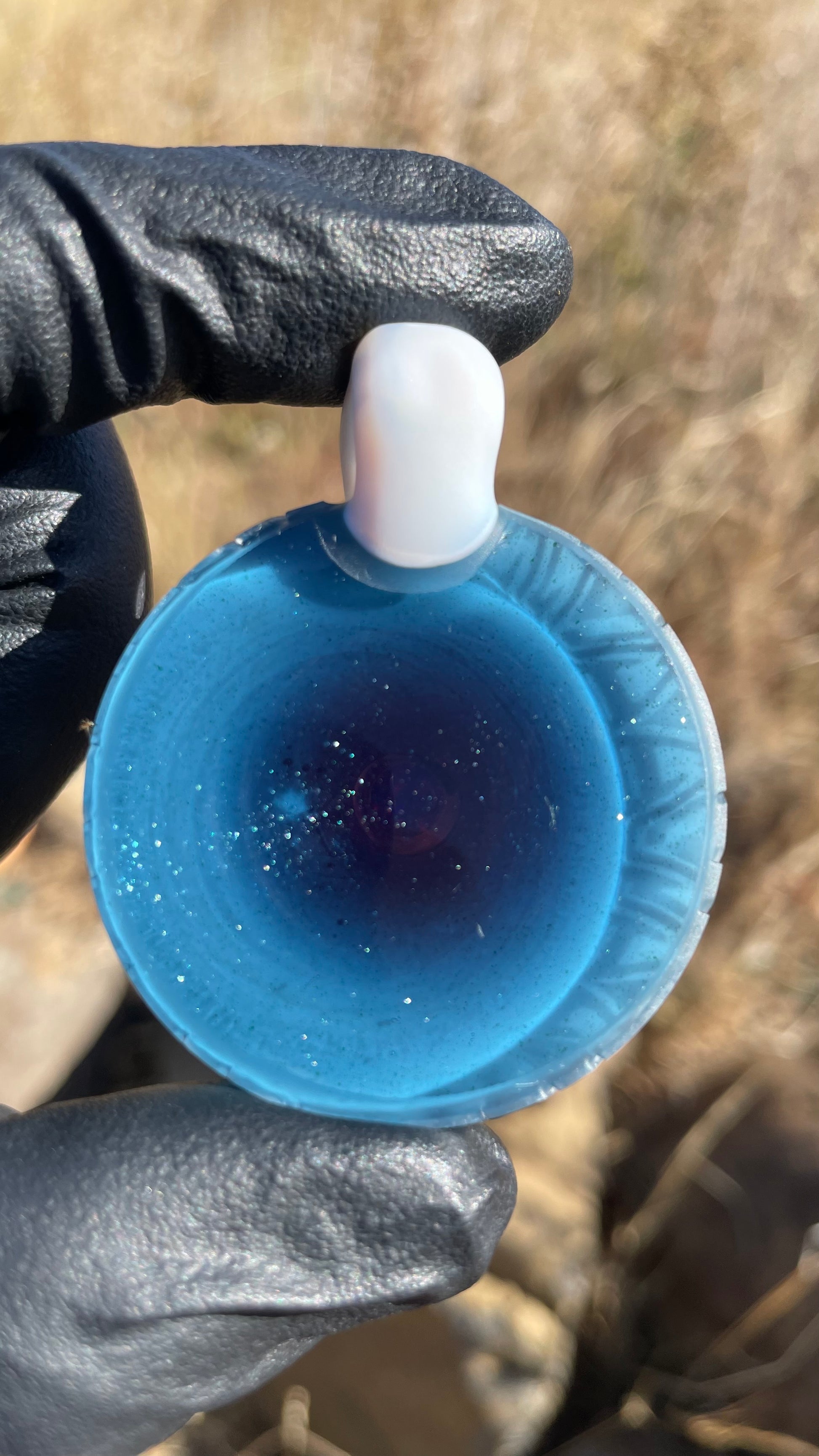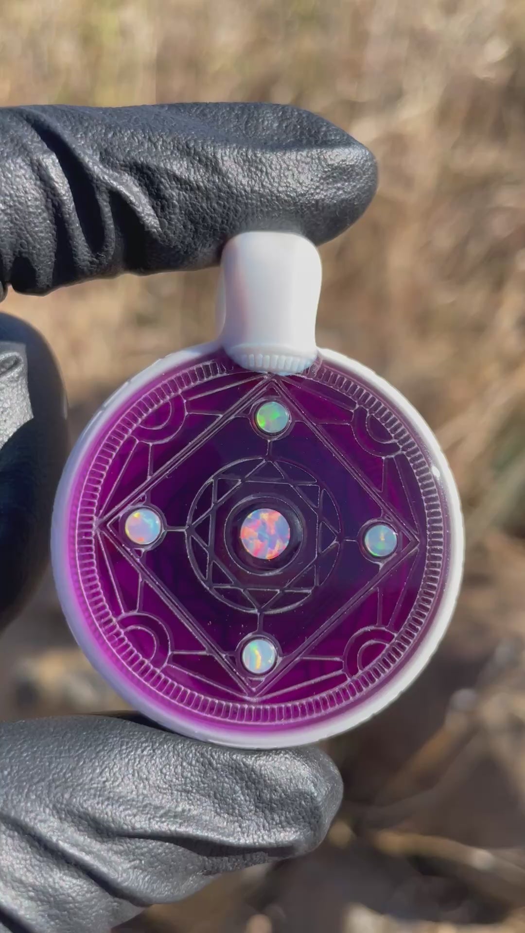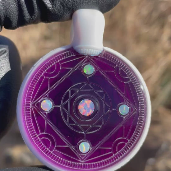 Borosilicate glass pendant featuring a deep carved pattern on the front and sides with four Gilson Opals.