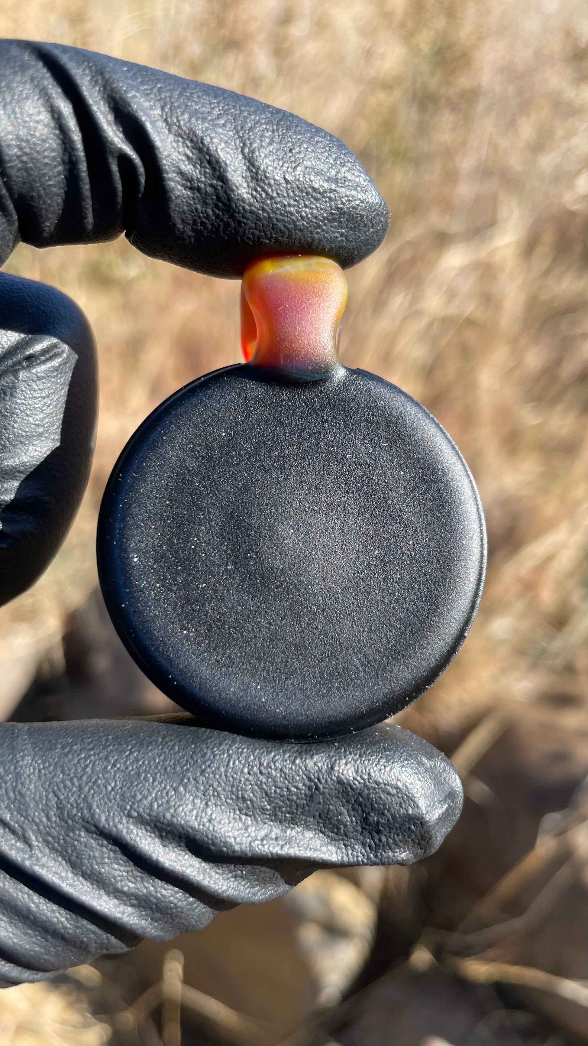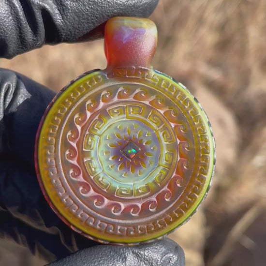 Borosilicate glass pendant featuring a deep carved pattern on the front and sides with one Gilson Opal.