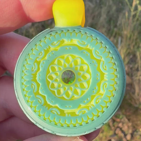 Borosilicate glass pendant featuring a deep carved pattern on the front and sides with one Gilson Opal.